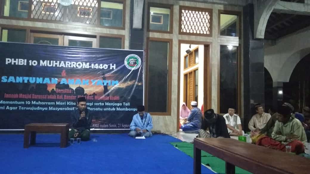 LP2M.CORONG- Peringati Hari Besar Islam 10 Muharram tahun 1440 H, BEM Fakultas Syariah bersama Jam’iyah Masjid Darussa’adah Kelurahan Bandar Kidul, Kecamatan Mojoroto santuni anak yatim, Minggu Malam (23/09).