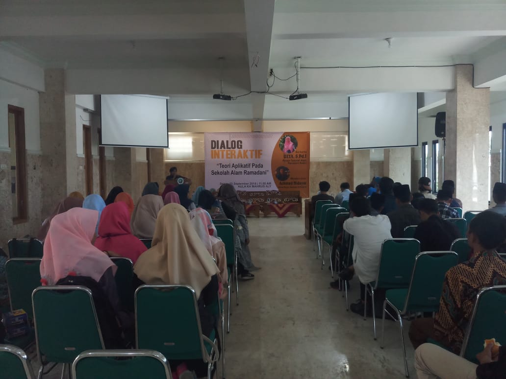 Pasca pembukaan selesai, mulailah memasuki acara inti yakni Dialog Interaktif dengan tema “Teori Aplikatf Pada Sekolah Alam Ramadhani” yang di pimpin oleh Ahmad Hidayat terlihat sebagai pemandu acara Atau moderator.
