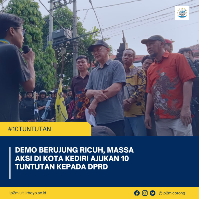 LP2M CORONG- Kediri, 24 Agustus 2024 – Ratusan massa yang terdiri dari berbagai elemen masyarakat dan mahasiswa Kota Kediri menggelar aksi demonstrasi di depan gedung Dewan Perwakilan Rakyat Daerah (DPRD) Kota Kediri. Dalam aksi ini, para demonstran mengajukan 10 tuntutan utama kepada DPRD Kota Kediri sebagai bentuk protes terhadap kebijakan-kebijakan yang dianggap merugikan masyarakat.