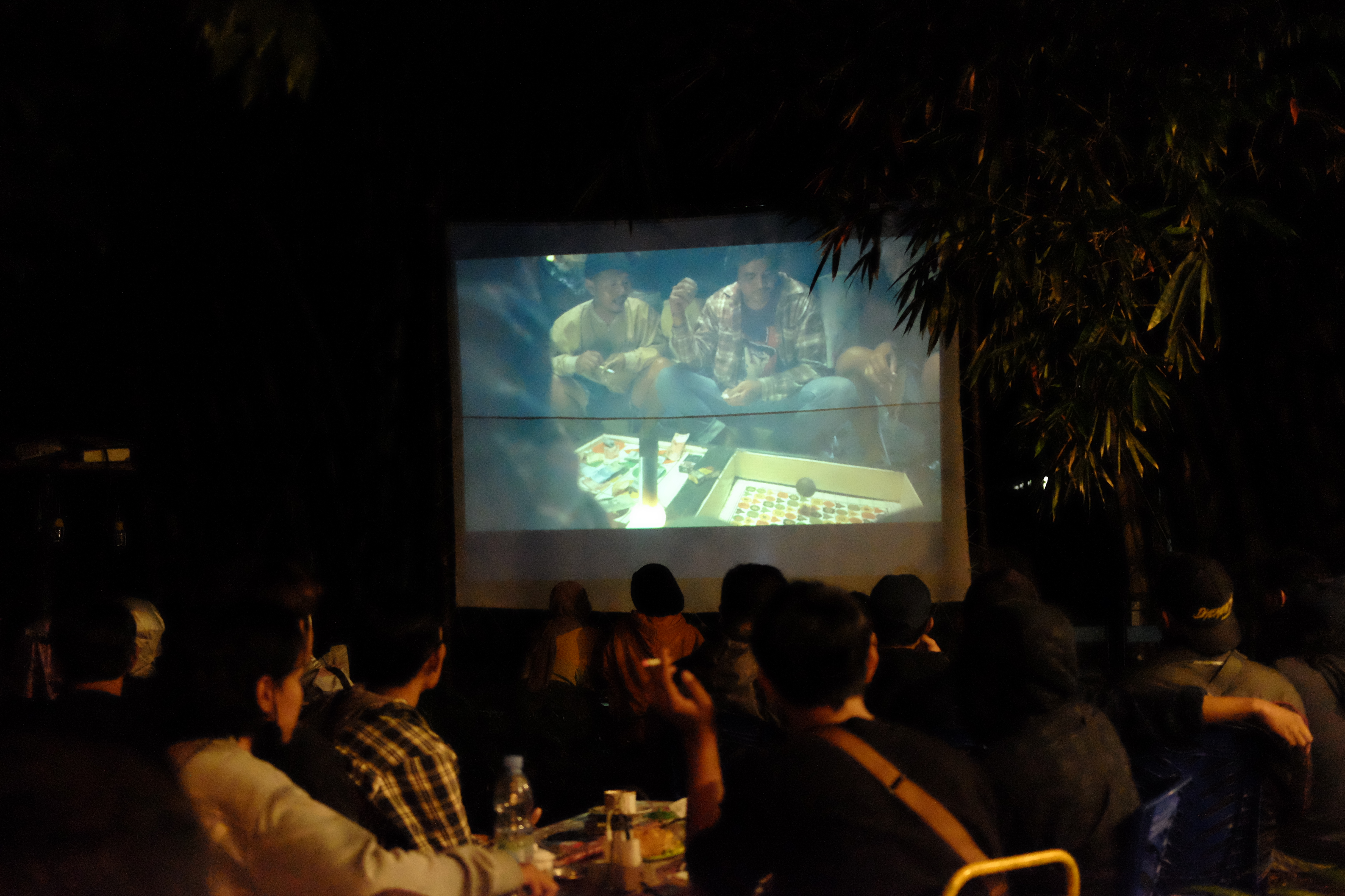 Tinggi, kokoh dan tegak menjadi sandaran Layar tancap. Pohon bambu tersebut menjadi saksi, kala malam mulai gelap dan hawa mulai mencekam. Puluhan orang mulai menempati kursi-kursi yang disediakan oleh warung Maspu Etan.