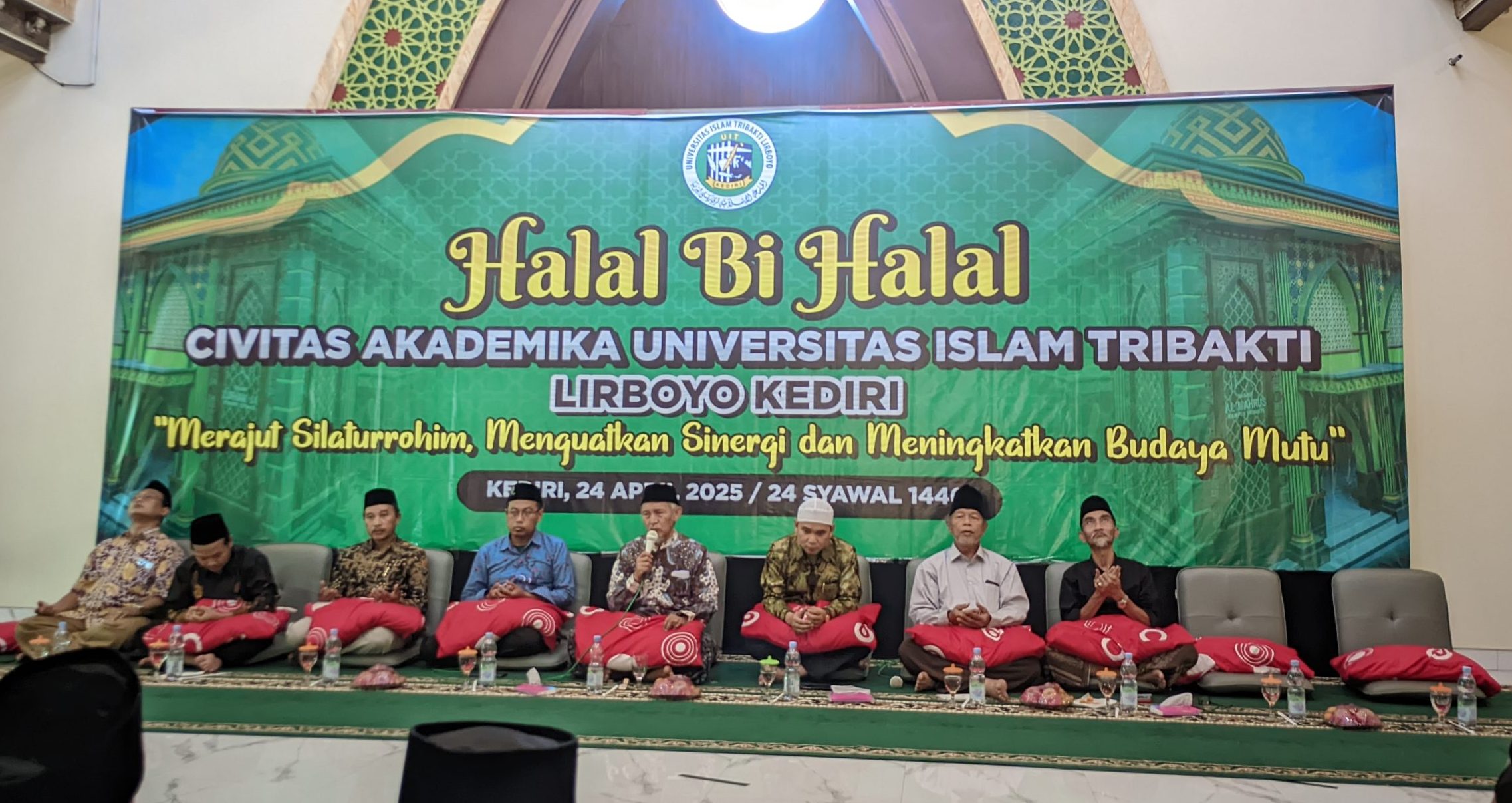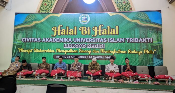 LP2M CORONG — Kediri, 24 April 2025 – Dalam rangka memperkuat ukhuwah Islamiyah pasca Idulfitri 1446 H, Universitas Islam Tribakti (UIT) Lirboyo Kediri menyelenggarakan kegiatan Halal bi Halal bagi seluruh civitas akademika. Dengan mengusung tema “Merajut Silaturrohim, Menguatkan Sinergi, dan Meningkatkan Budaya Mutu,” kegiatan ini bertujuan untuk membangun kembali semangat silaturahim, memperkuat sinergi antar unsur kampus, serta menumbuhkan budaya mutu dalam lingkungan akademik dan kelembagaan.