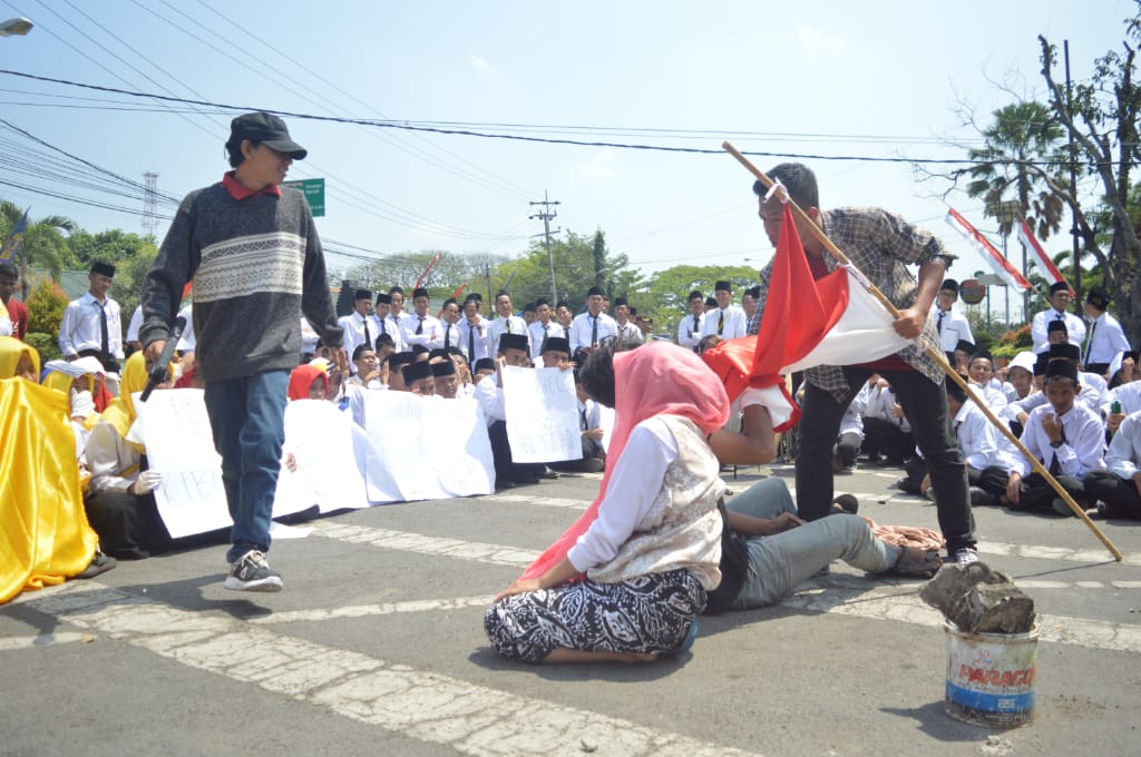 LP2M.Corong-Peserta aksi yang berjumlah 350 mahasiswa baru IAI Tribakti Kediri, mulai memenuhi bundaran sekartaji kota kediri (21/08).